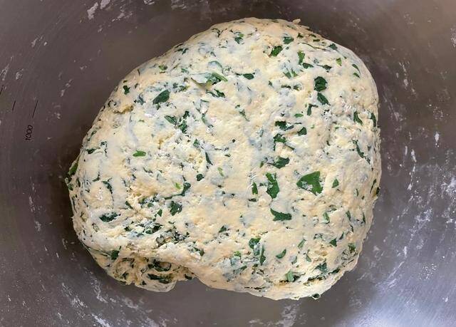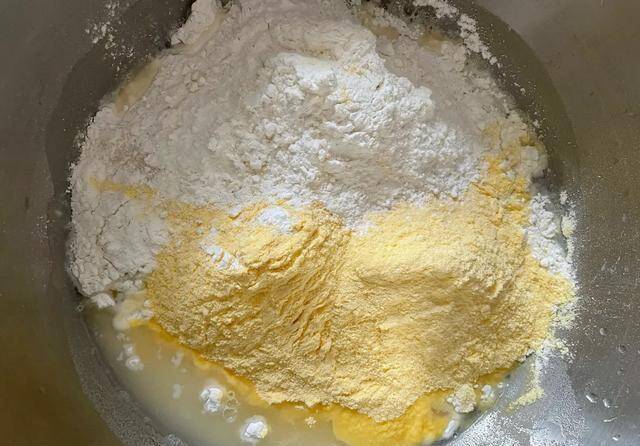 2. 玉米面、白面、小苏打放入盆中,加少许盐拌匀,放入芹菜叶碎;